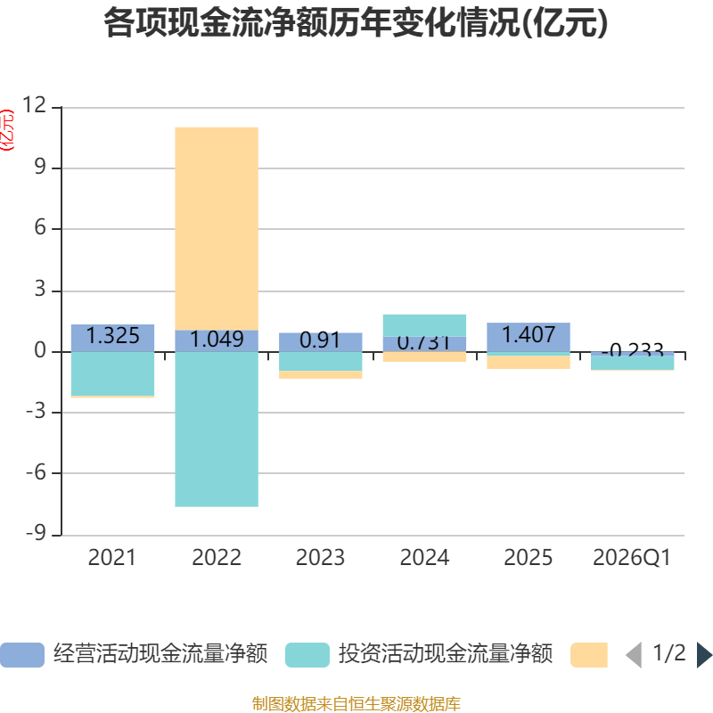 截至2026年一季度末,公司经营活动现金流净额为-2327.69万元,同比减少2494.46万元;筹资活动现金流净额-311.59万元,同比增加9.82万元;投资活动现金流净额-6738.79万元,上年同期为-235.89万元。