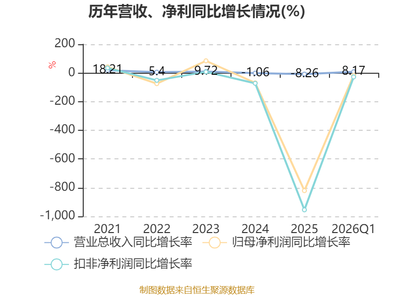 中证智能财讯抚顺特钢(600399)4月25日披露2026年第一季度报告。公司实现营业总收入18.99亿元,同比增长8.17%;归母净利润亏损1.46亿元,上年同期亏损1.25亿元;扣非净利润亏损1.57亿元,上年同期亏损1.23亿元;经营活动产生的现金流量净额为-6.53亿元,上年同期为-6.58亿元;报告期内,抚顺特钢基本每股收益为-0.0746元,加权平均净资产收益率为-2.69%。