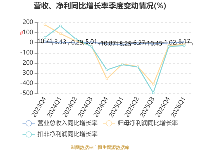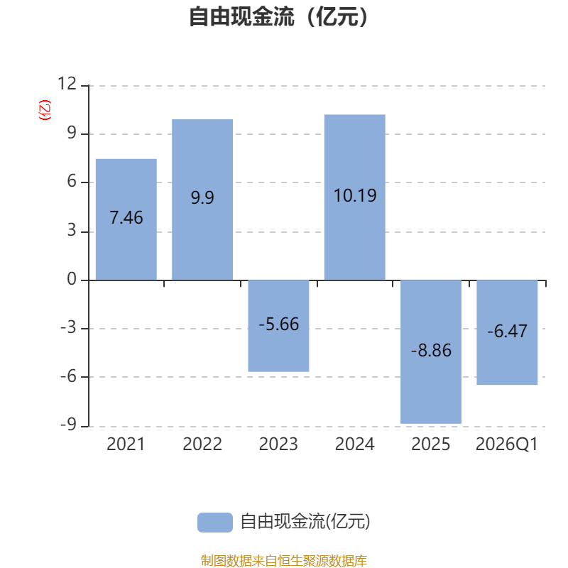 截至2026年一季度末,公司经营活动现金流净额为-6.53亿元,同比增加483.28万元;筹资活动现金流净额6.01亿元,同比增加3839.72万元;投资活动现金流净额2424.57万元,上年同期为1717.03万元。