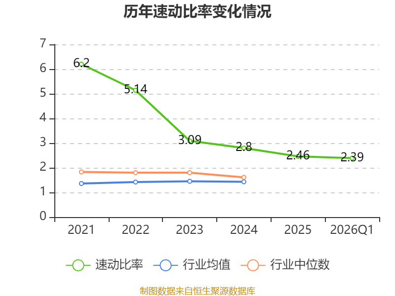 2026年第一季度,公司流动比率为2.61,速动比率为2.39。