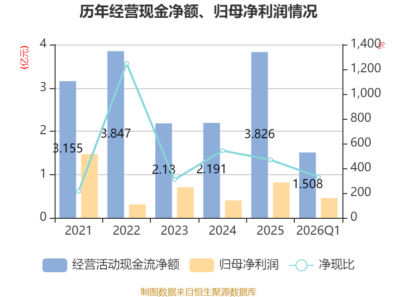 截至2026年一季度末,公司经营活动现金流净额为1.51亿元,同比下降17.65%;筹资活动现金流净额-555.69万元,同比减少555.69万元;投资活动现金流净额-2128.47万元,上年同期为-4322.54万元。