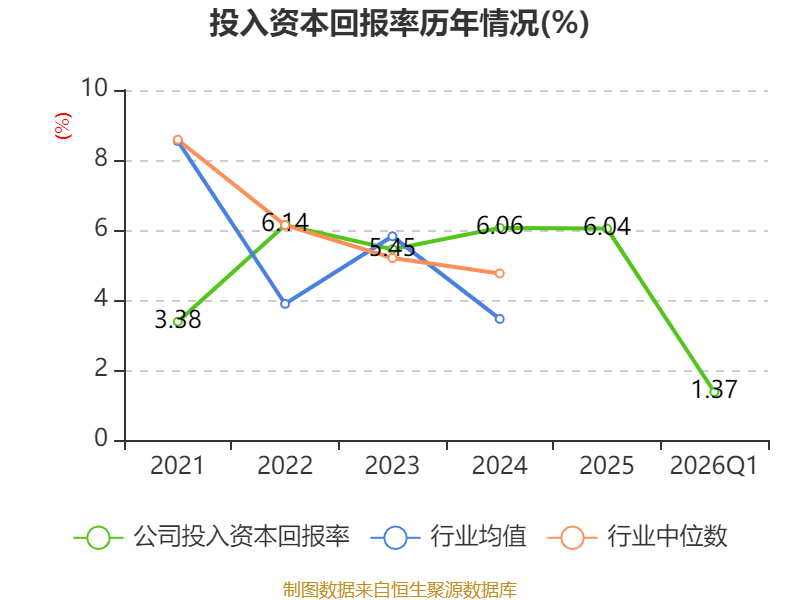 盈利能力方面, 2026年一季度公司加权平均净资产收益率为1.69%,同比下降0.54个百分点。公司2026年第一季度投入资本回报率为1.37%,较上年同期下降0.46个百分点。
