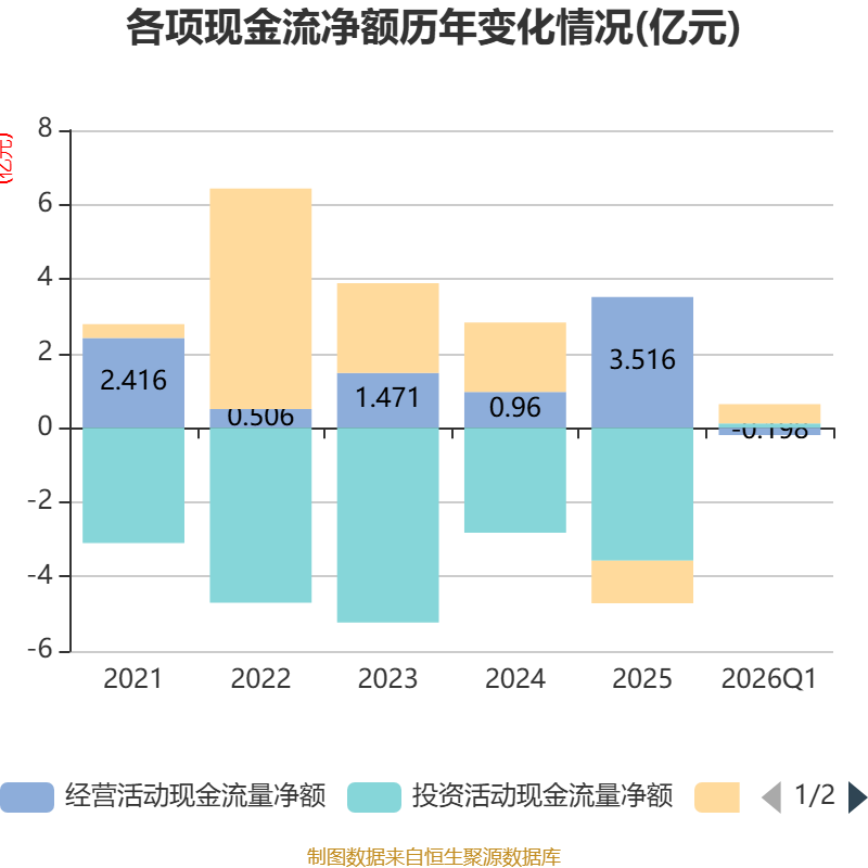 截至2026年一季度末,公司经营活动现金流净额为-1982.57万元,同比增加4.61亿元;筹资活动现金流净额5160.14万元,同比减少4.29亿元;投资活动现金流净额1179.35万元,上年同期为-6824.09万元。