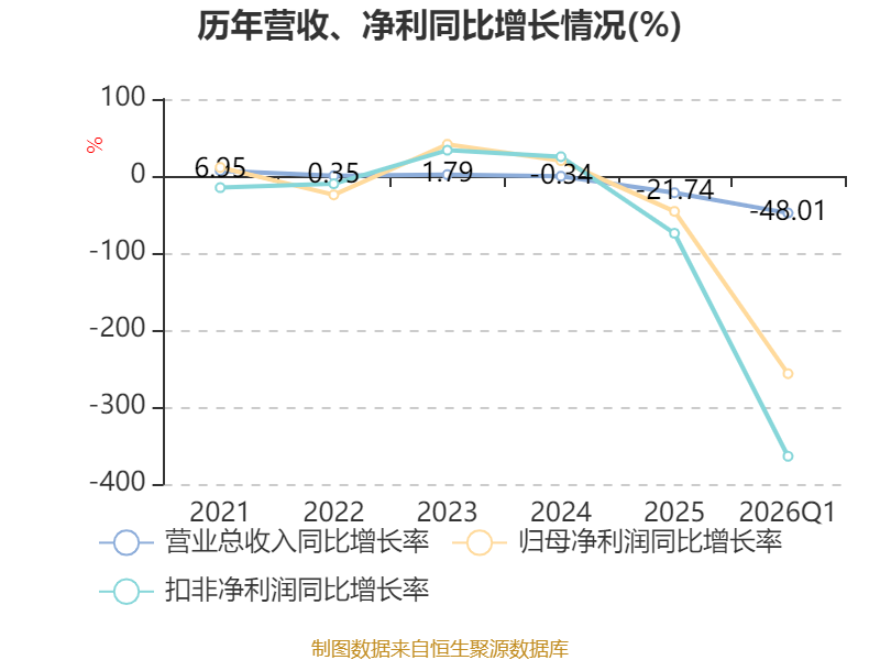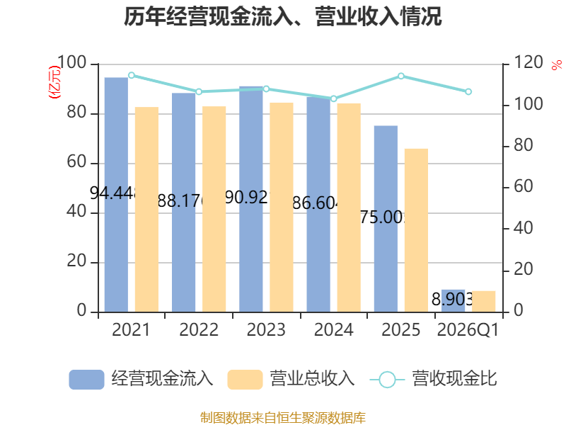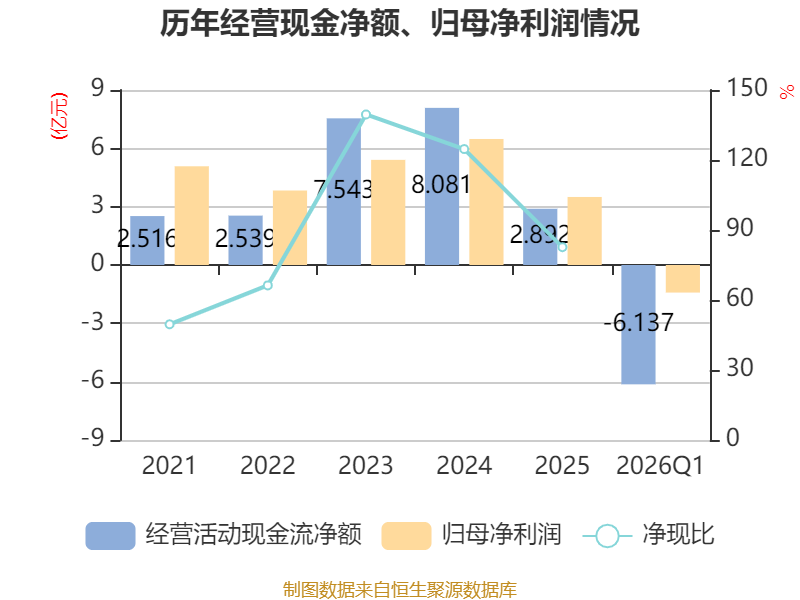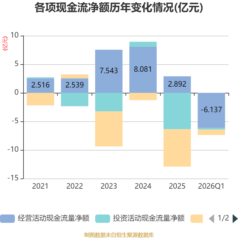 截至2026年一季度末,公司经营活动现金流净额为-6.14亿元,同比减少4.74亿元;筹资活动现金流净额-9584.78万元,同比减少2.23亿元;投资活动现金流净额-3025.25万元,上年同期为-10.44亿元。