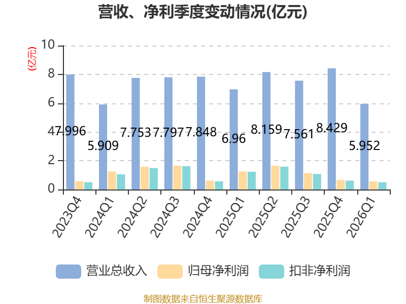 负债重大变化方面,截至2026年一季度末,公司应付职工薪酬较上年末减少47.83%,占公司总资产比重下降0.78个百分点;应付票据及应付账款较上年末增加29.09%,占公司总资产比重上升0.59个百分点;长期借款较上年末增加10.74%,占公司总资产比重上升0.59个百分点;长期应付款合计较上年末增加26.78%,占公司总资产比重上升0.56个百分点。