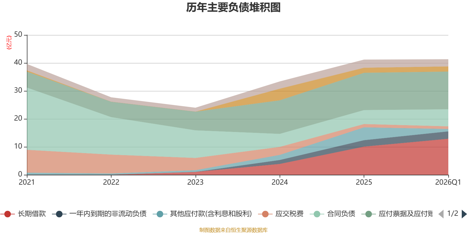 负债重大变化方面,截至2026年一季度末,公司其他应付款(含利息和股利)较上年末减少81.31%,占公司总资产比重下降4.35个百分点;长期借款较上年末增加28.02%,占公司总资产比重上升3.21个百分点;合同负债较上年末增加22.17%,占公司总资产比重上升1.26个百分点;一年内到期的非流动负债较上年末增加14.2%,占公司总资产比重上升0.37个百分点。