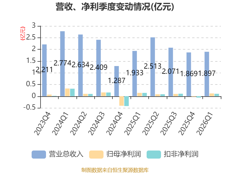 中证智能财讯全信股份(300447)4月25日披露2026年第一季度报告。公司实现营业总收入1.9亿元,同比下降1.85%;归母净利润1166.22万元,同比下降16.92%;扣非净利润1009.91万元,同比下降27.70%;经营活动产生的现金流量净额为-4381.01万元,上年同期为6160.43万元;报告期内,全信股份基本每股收益为0.0377元,加权平均净资产收益率为0.58%。
