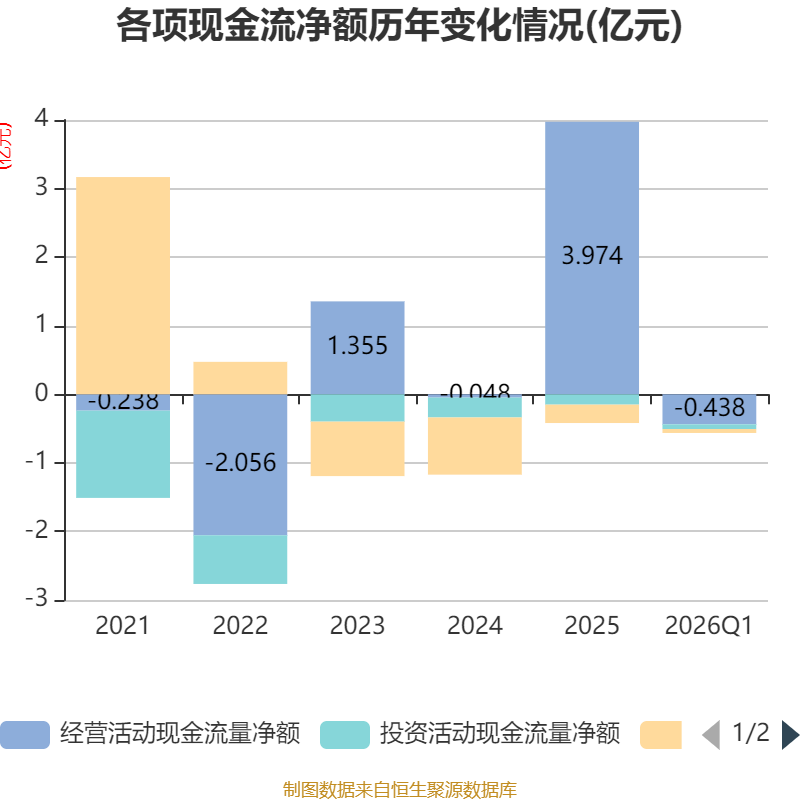 截至2026年一季度末,公司经营活动现金流净额为-4381.01万元,同比减少1.05亿元;筹资活动现金流净额-571.88万元,同比减少513.48万元;投资活动现金流净额-685.68万元,上年同期为-375.77万元。