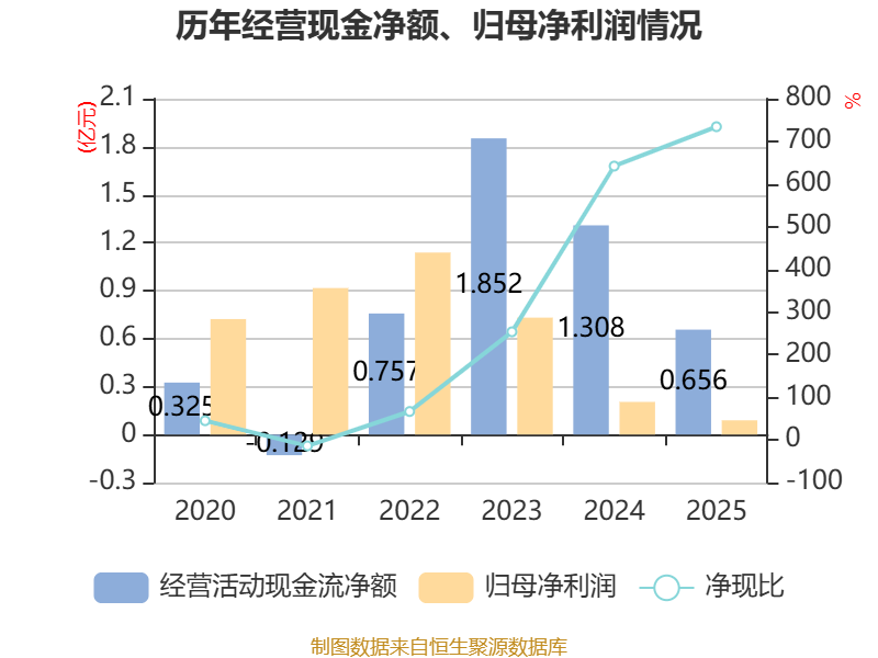 截至2025年,公司经营活动现金流净额为6563.75万元,同比下降49.83%;筹资活动现金流净额491.42万元,同比增加1.15亿元;投资活动现金流净额-9562.72万元,上年同期为-5509.03万元。