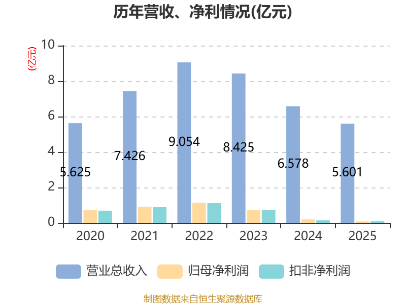 中证智能财讯德生科技(002908)4月25日披露2025年年度报告。2025年,公司实现营业总收入5.6亿元,同比下降14.85%;归母净利润893.87万元,同比下降56.13%;扣非净利润1020.06万元,同比下降32.60%;经营活动产生的现金流量净额为6563.75万元,同比下降49.83%;报告期内,德生科技基本每股收益为0.0209元,加权平均净资产收益率为0.80%。公司2025年度分配预案为:拟向全体股东每10股派现0.5元(含税)。