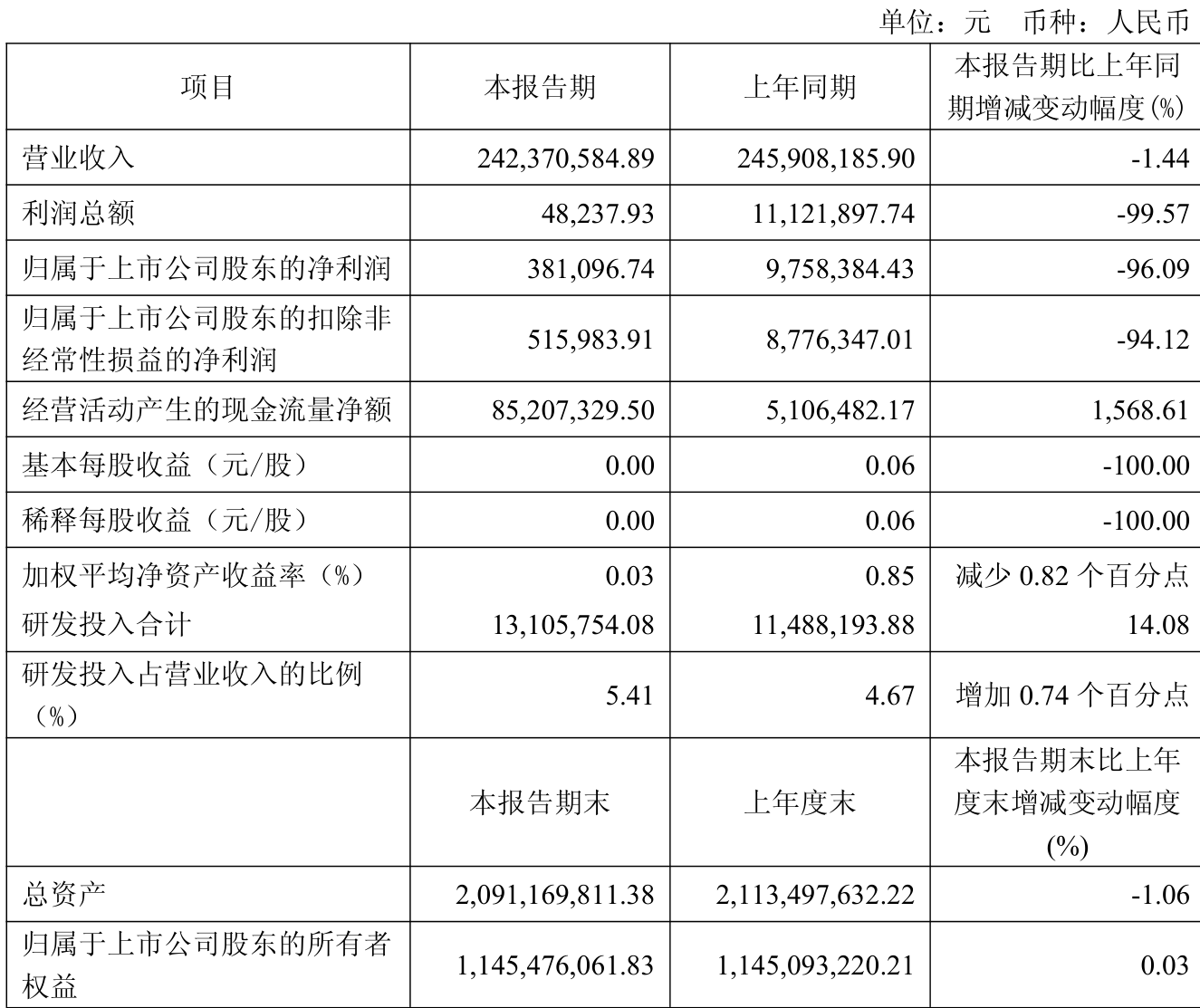 中证智能财讯赛特新材(688398)4月25日披露2026年第一季度报告。公司实现营业总收入2.42亿元,同比下降1.44%;归母净利润38.11万元,同比下降96.09%;扣非净利润51.6万元,同比下降94.12%;经营活动产生的现金流量净额为8520.73万元,同比增长1568.61%;加权平均净资产收益率为0.03%。