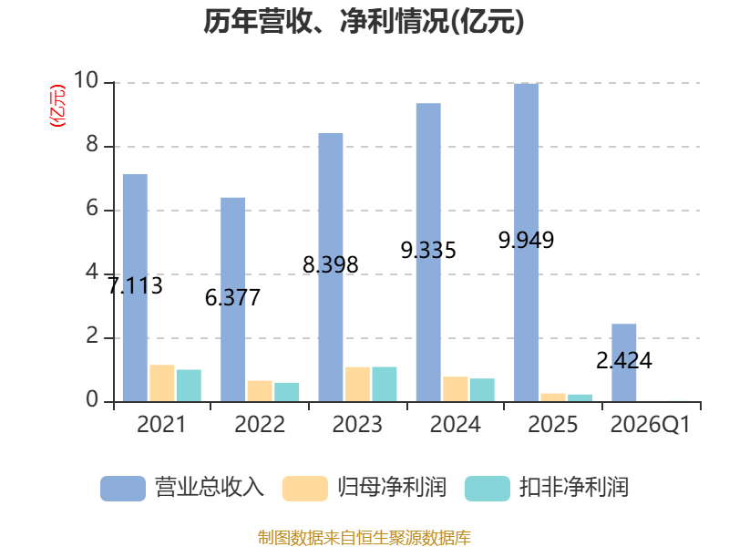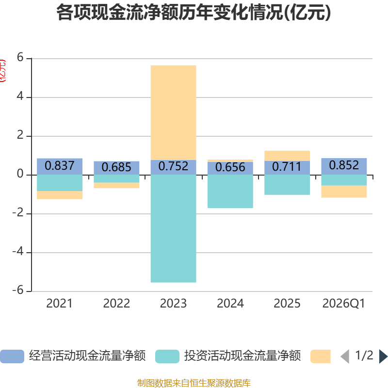 截至2026年一季度末,公司经营活动现金流净额为8520.73万元,同比增长1568.61%;筹资活动现金流净额-6184.22万元,同比减少1.03亿元;投资活动现金流净额-5707.87万元,上年同期为-4295.36万元。