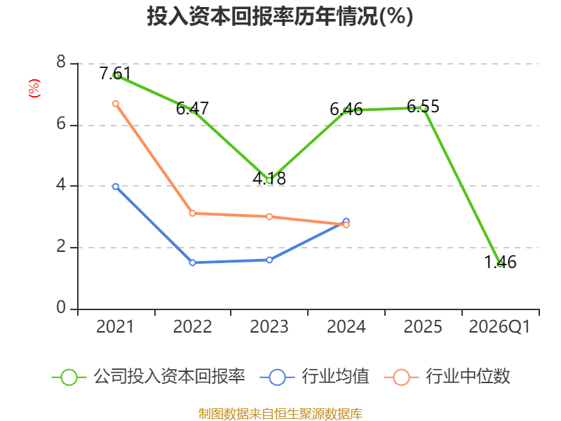 盈利能力方面, 2026年一季度公司加权平均净资产收益率为1.45%,同比上升0.05个百分点。公司2026年第一季度投入资本回报率为1.46%,较上年同期上升0.14个百分点。