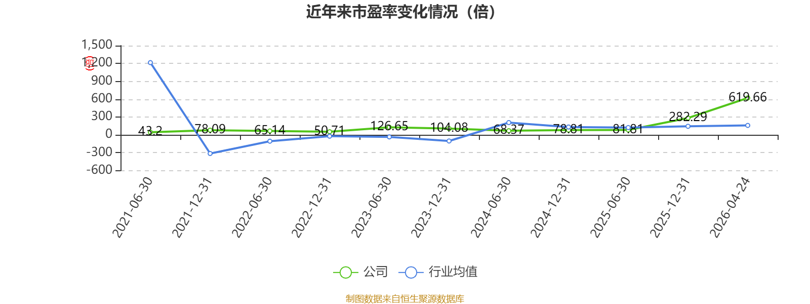 以4月24日收盘价计算,腾景科技目前市盈率(TTM)约为619.66倍,市净率(LF)约43.84倍,市销率(TTM)约69.35倍。