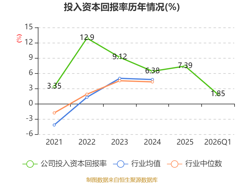 盈利能力方面, 2026年一季度公司加权平均净资产收益率为2.03%,同比下降0.13个百分点。公司2026年第一季度投入资本回报率为1.85%,较上年同期下降0.2个百分点。