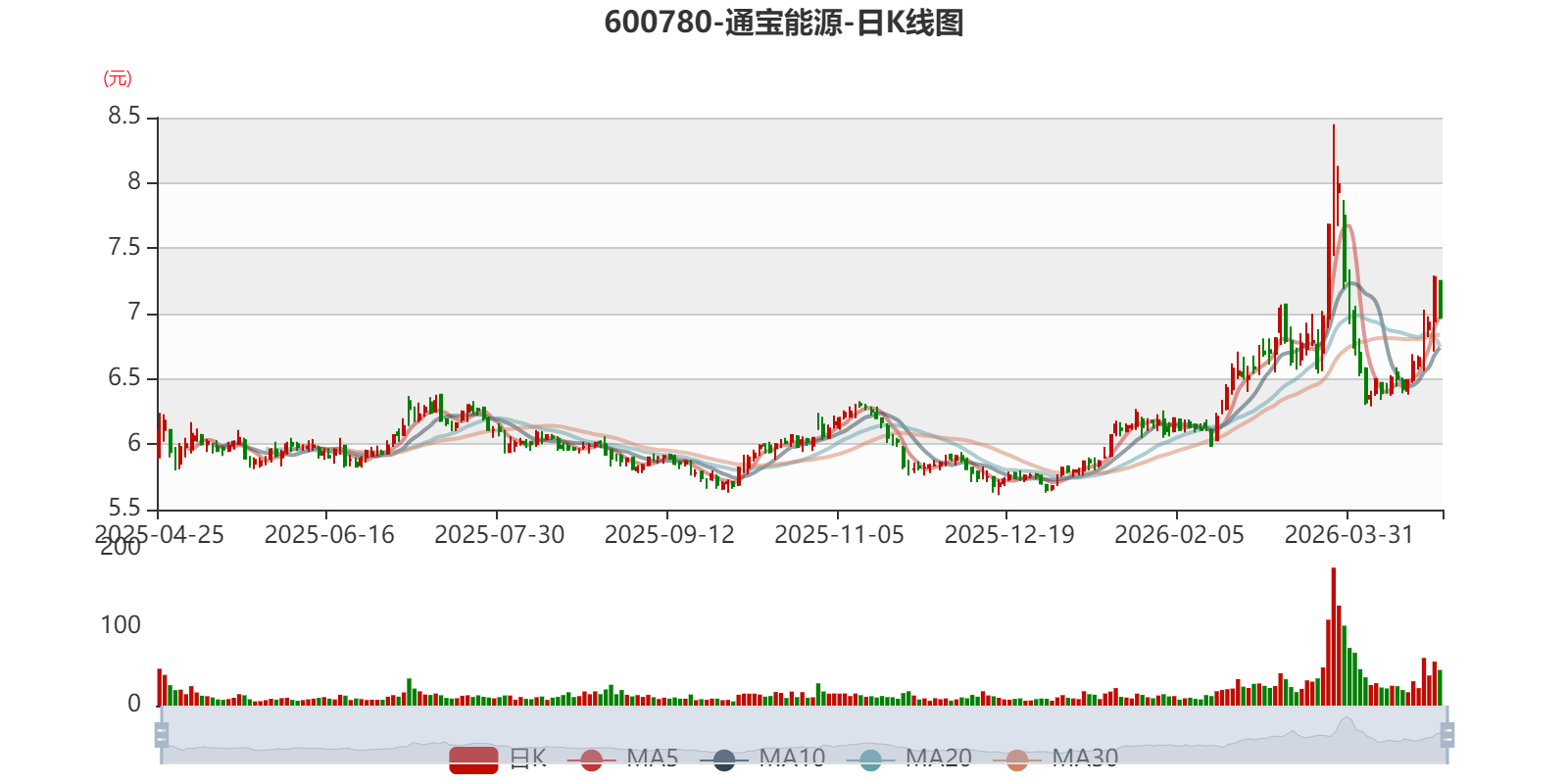 中证智能财讯通宝能源(600780)4月25日披露2026年第一季度报告。公司实现营业总收入30.77亿元,同比下降1.26%;归母净利润1.72亿元,同比增长2.19%;扣非净利润1.69亿元,同比增长0.93%;经营活动产生的现金流量净额为3.34亿元,同比增长14.75%;报告期内,通宝能源基本每股收益为0.1501元,加权平均净资产收益率为2.03%。