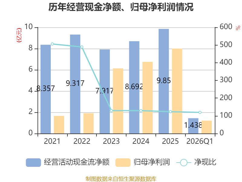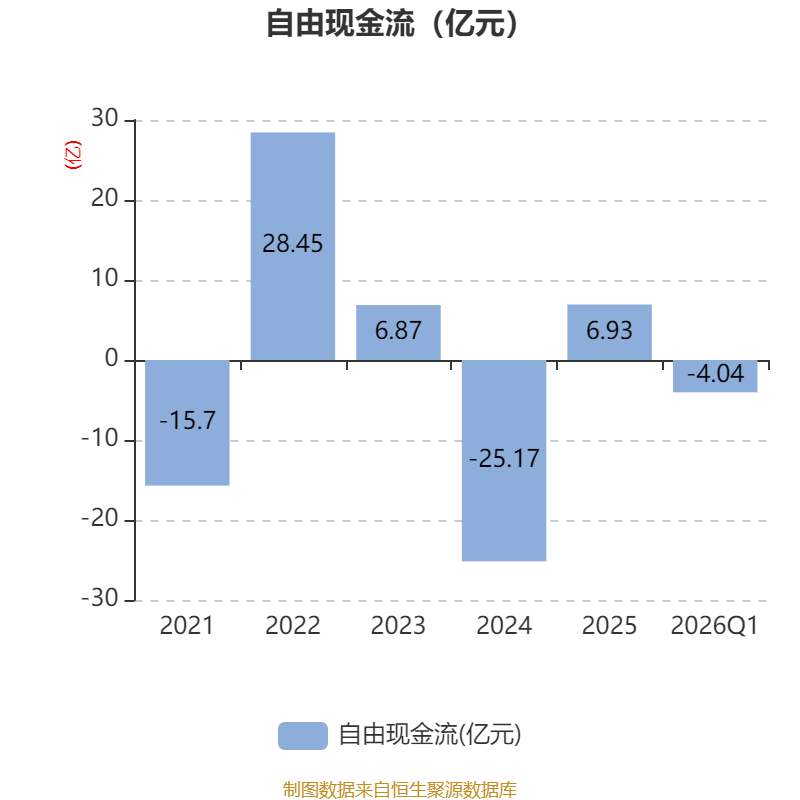截至2026年一季度末,公司经营活动现金流净额为1.44亿元,同比下降29.52%;筹资活动现金流净额-9594.15万元,同比减少2.61亿元;投资活动现金流净额-3.33亿元,上年同期为-3.33亿元。