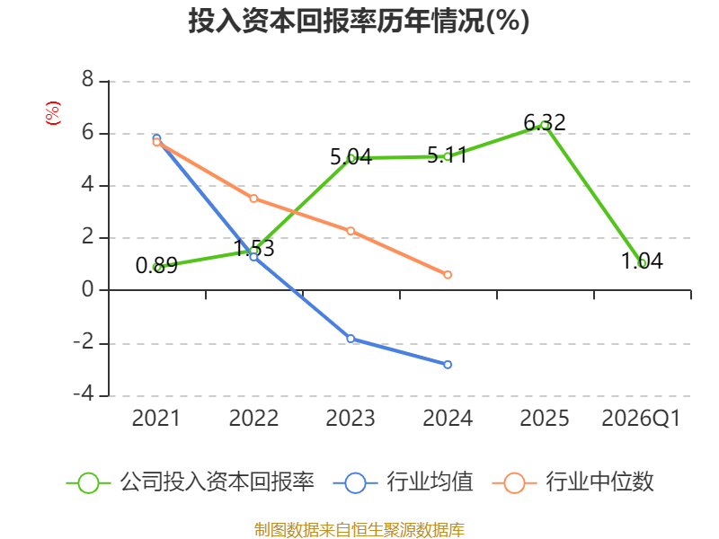 盈利能力方面, 2026年一季度公司加权平均净资产收益率为1.15%,同比下降0.77个百分点。公司2026年第一季度投入资本回报率为1.04%,较上年同期下降0.39个百分点。