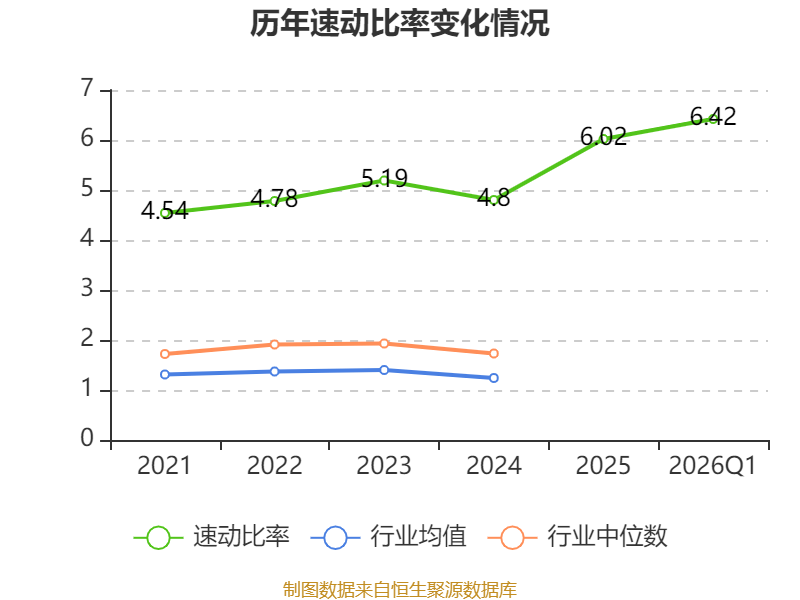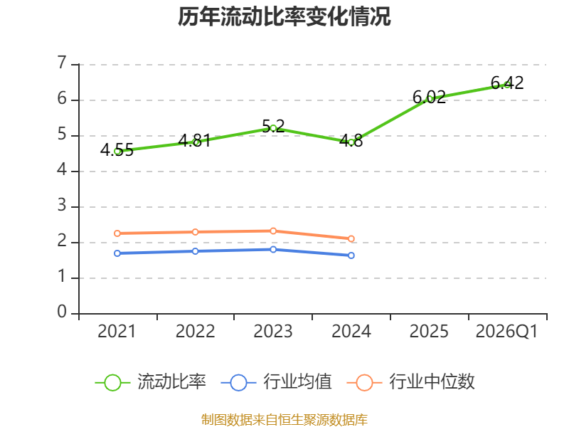 2026年第一季度,公司流动比率为6.42,速动比率为6.42。