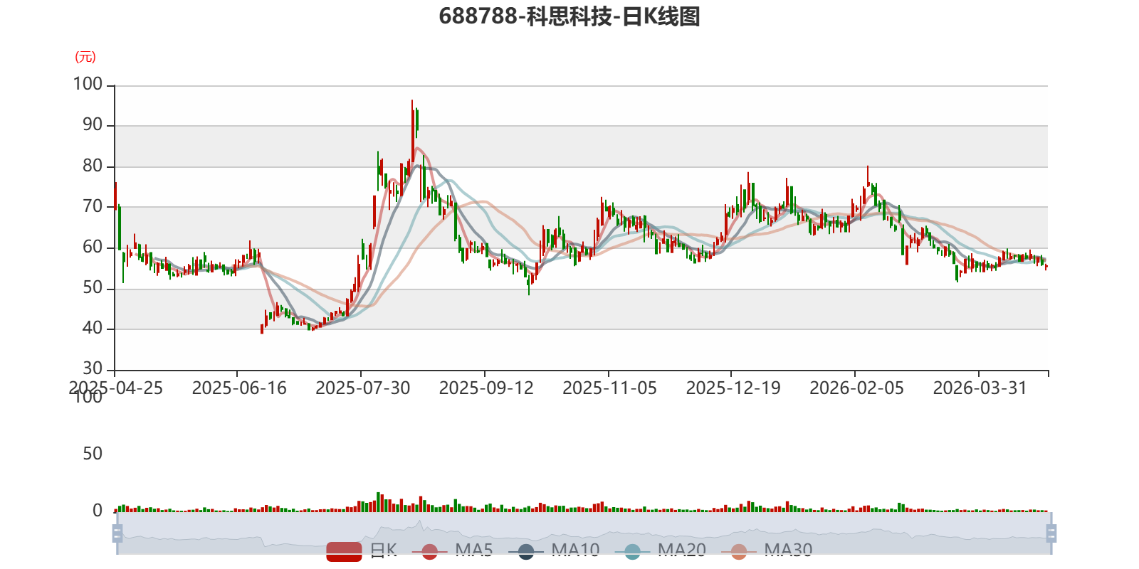 中证智能财讯科思科技(688788)4月25日披露2026年第一季度报告。公司实现营业总收入2843.21万元,同比增长36.96%;归母净利润亏损7258.82万元,上年同期亏损5835.25万元;扣非净利润亏损7253.5万元,上年同期亏损6081.27万元;经营活动产生的现金流量净额为-5373.03万元,上年同期为-5238.81万元;报告期内,科思科技基本每股收益为-0.4681元,加权平均净资产收益率为-4.04%。