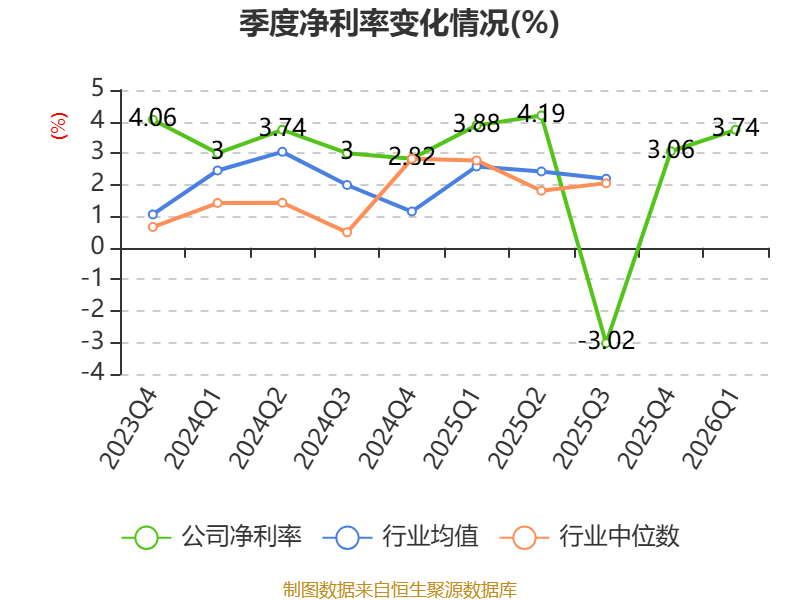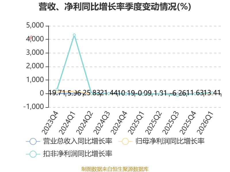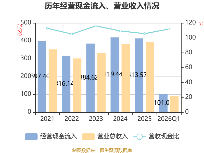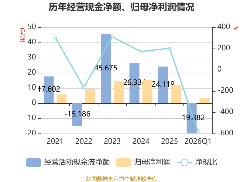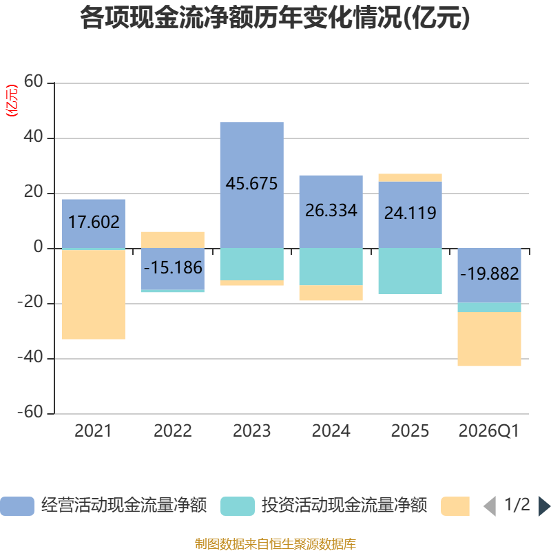 截至2026年一季度末,公司经营活动现金流净额为-19.88亿元,同比增加3.09亿元;筹资活动现金流净额-19.57亿元,同比减少7.84亿元;投资活动现金流净额-3.37亿元,上年同期为-3.38亿元。