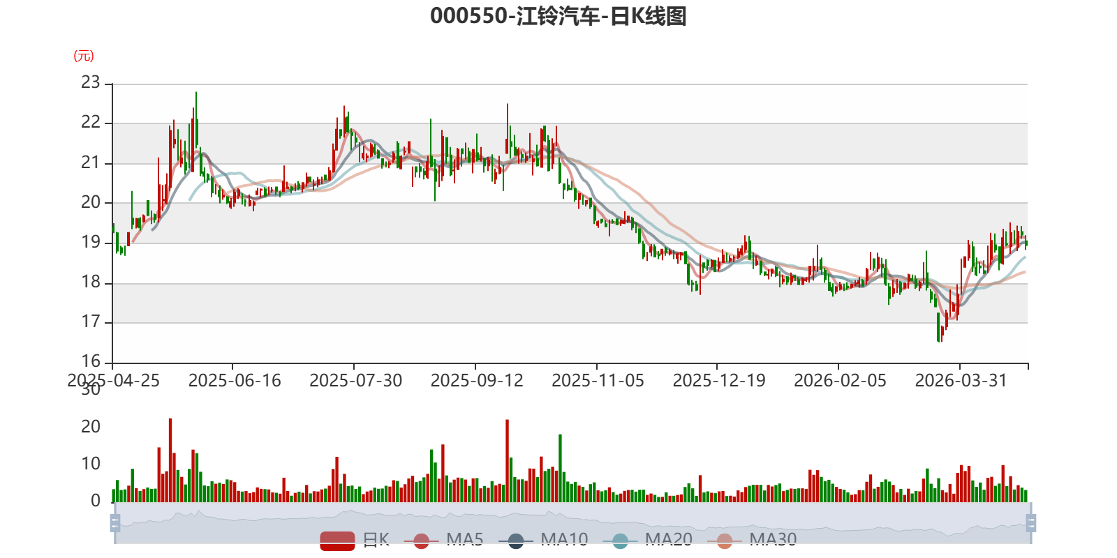 中证智能财讯江铃汽车(000550)4月25日披露2026年第一季度报告。公司实现营业总收入90.36亿元,同比增长13.41%;归母净利润3.4亿元,同比增长11.27%;扣非净利润2.52亿元,同比增长71.23%;经营活动产生的现金流量净额为-19.88亿元,上年同期为-22.97亿元;报告期内,江铃汽车基本每股收益为0.4元,加权平均净资产收益率为2.87%。