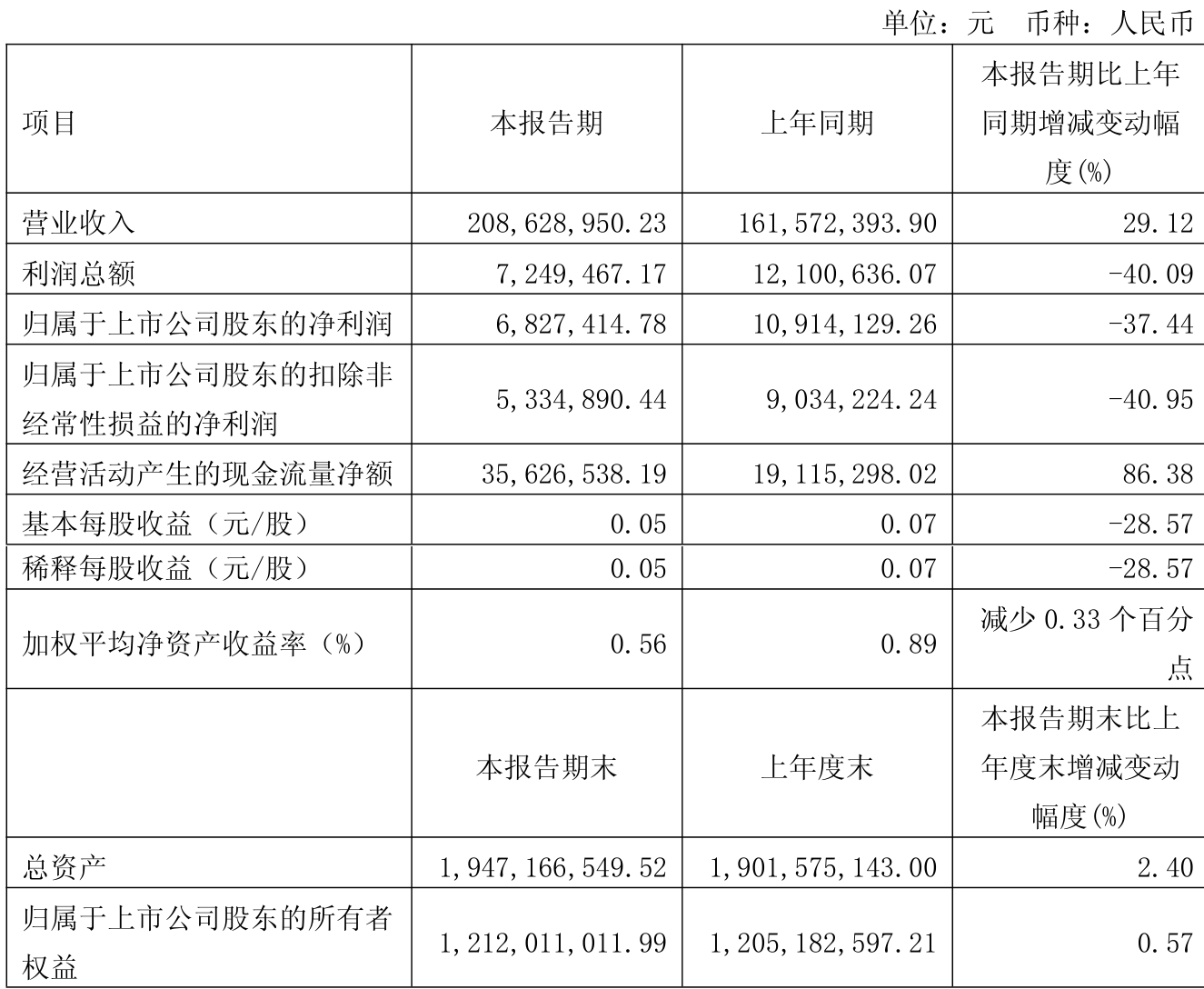 中证智能财讯正川股份(603976)4月25日披露2026年第一季度报告。公司实现营业总收入2.09亿元,同比增长29.12%;归母净利润682.74万元,同比下降37.44%;扣非净利润533.49万元,同比下降40.95%;经营活动产生的现金流量净额为3562.65万元,同比增长86.38%;报告期内,正川股份基本每股收益为0.05元,加权平均净资产收益率为0.56%。