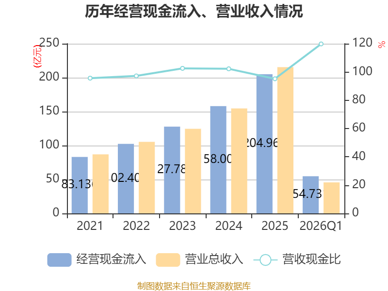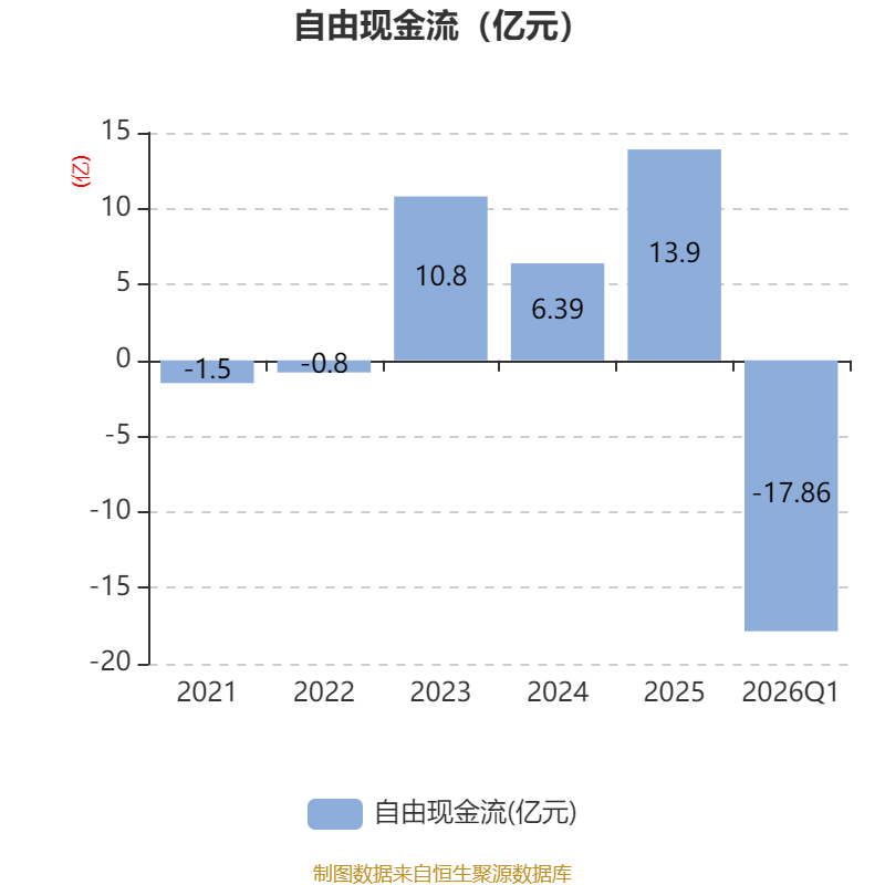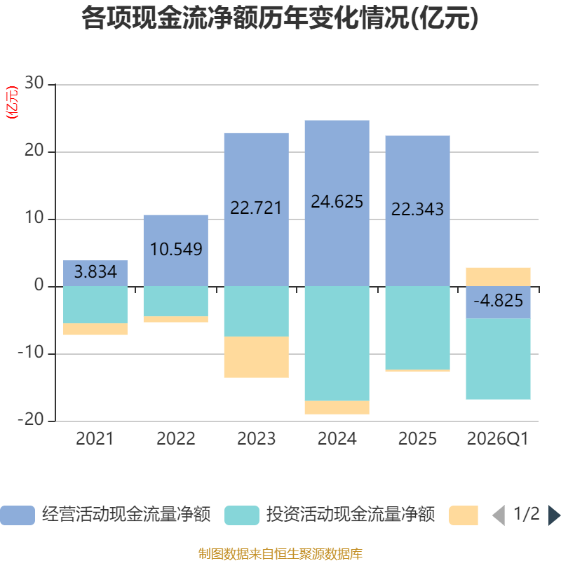 截至2026年一季度末,公司经营活动现金流净额为-4.83亿元,同比增加7625.74万元;筹资活动现金流净额2.73亿元,同比增加2.26亿元;投资活动现金流净额-12.01亿元,上年同期为-5.93亿元。