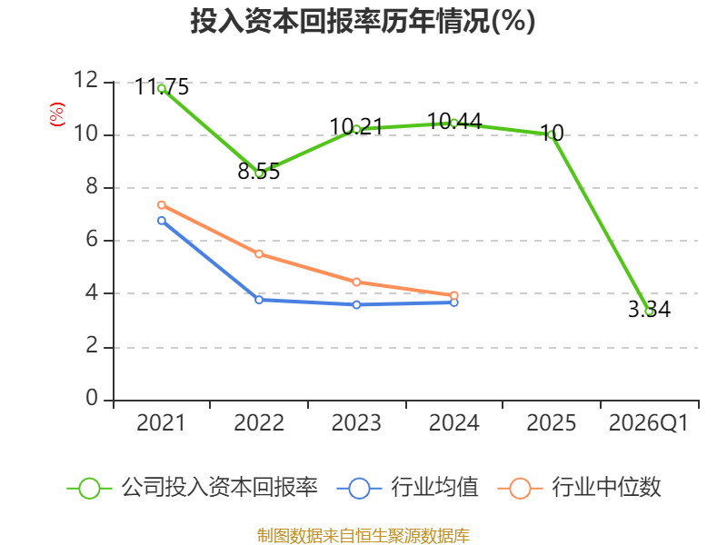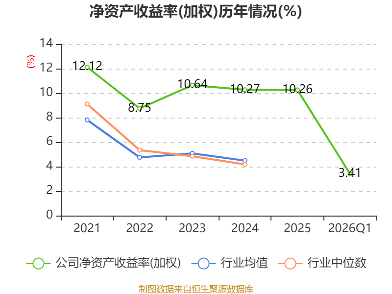 盈利能力方面, 2026年一季度公司加权平均净资产收益率为3.41%,同比上升0.38个百分点。公司2026年第一季度投入资本回报率为3.34%,较上年同期上升0.39个百分点。