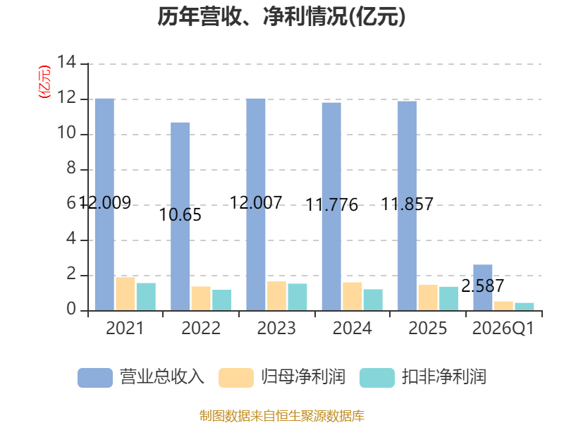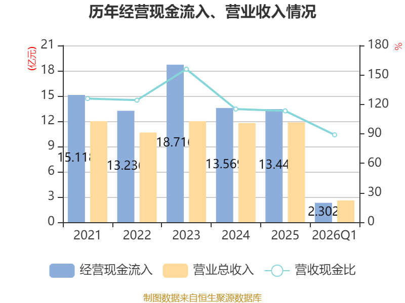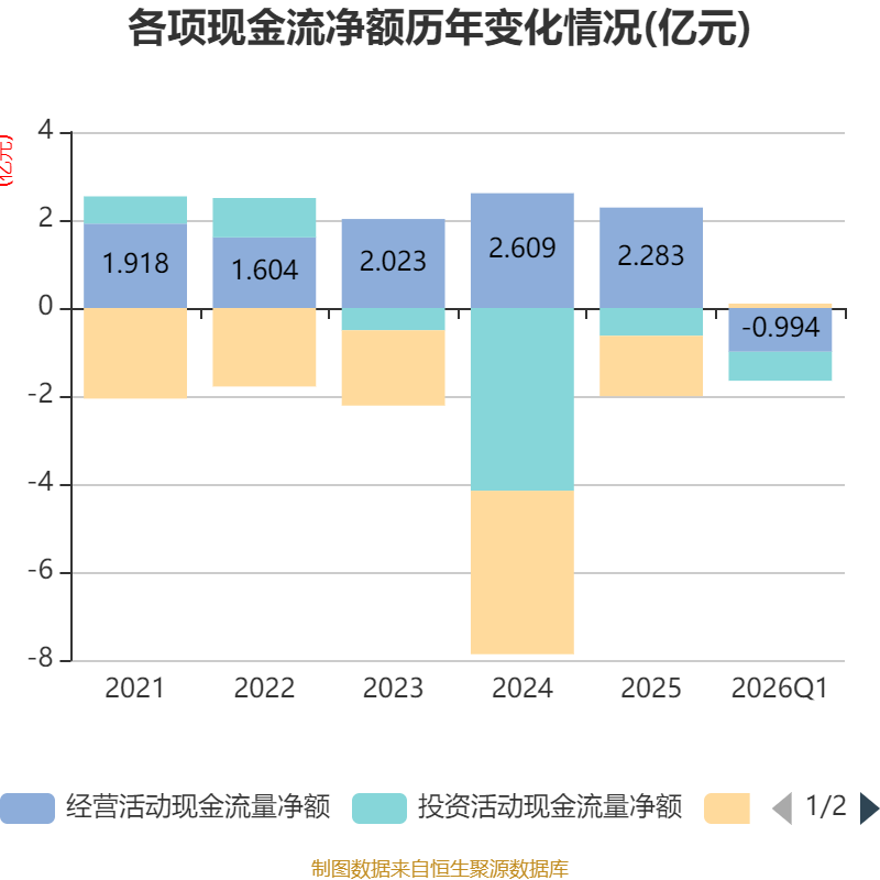 截至2026年一季度末,公司经营活动现金流净额为-9944.9万元,同比减少238.7万元;筹资活动现金流净额996.89万元,同比增加544.91万元;投资活动现金流净额-6590.64万元,上年同期为-2099.28万元。
