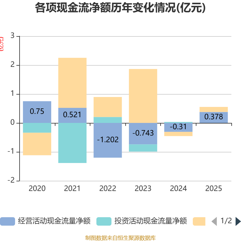 截至2025年,公司经营活动现金流净额为3777.68万元,同比增加6873.2万元;筹资活动现金流净额1742.73万元,同比增加3190.8万元;投资活动现金流净额11.57万元,上年同期为332.42万元。