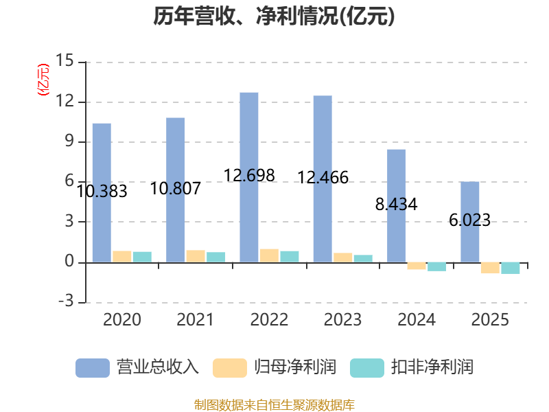 中证智能财讯建工修复(300958)4月25日披露2025年年度报告。2025年,公司实现营业总收入6.02亿元,同比下降28.59%;归母净利润亏损8418.75万元,上年同期亏损5524.39万元;扣非净利润亏损8876.75万元,上年同期亏损6796.74万元;经营活动产生的现金流量净额为3777.68万元,上年同期为-3095.53万元;报告期内,建工修复基本每股收益为-0.54元,加权平均净资产收益率为-6.62%。