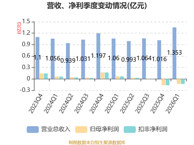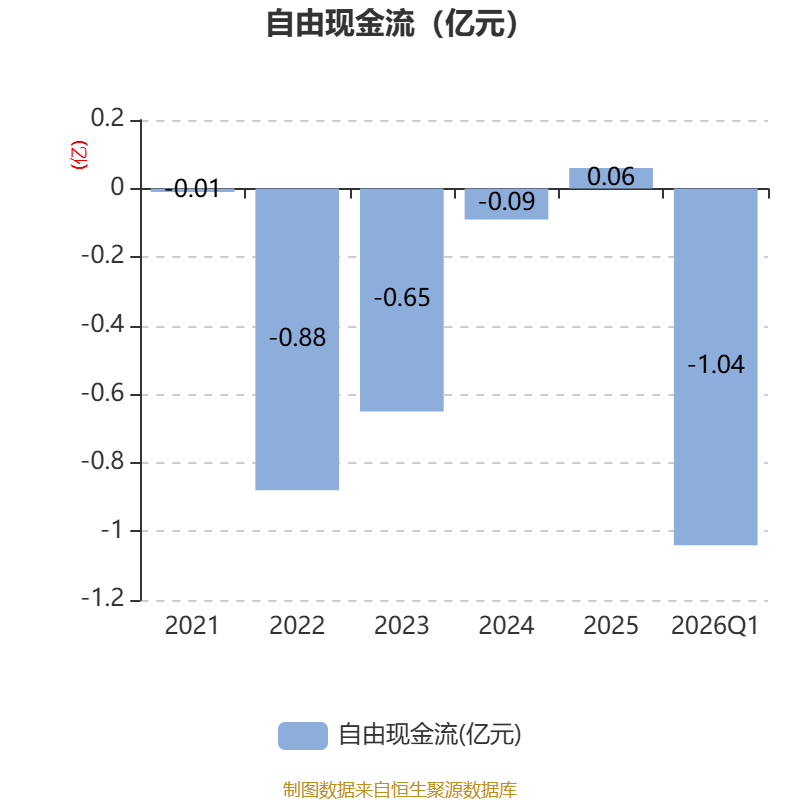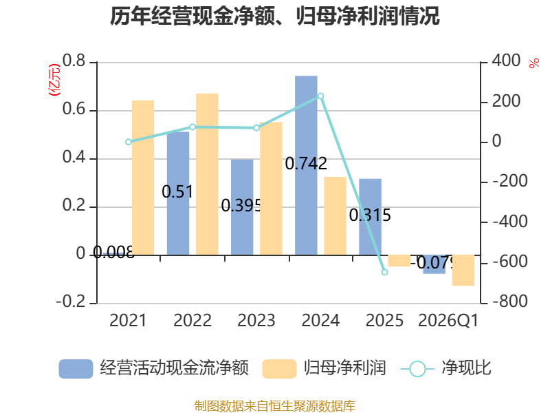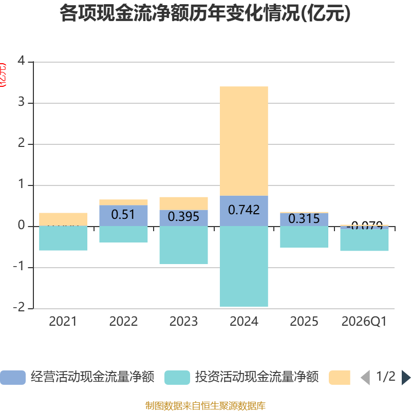 截至2026年一季度末,公司经营活动现金流净额为-786.82万元,同比减少1339.53万元;筹资活动现金流净额314.86万元,同比增加1169.14万元;投资活动现金流净额-5235.42万元,上年同期为-4090.63万元。