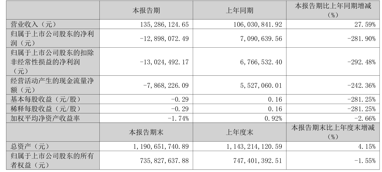 中证智能财讯美信科技(301577)4月25日披露2026年第一季度报告。公司实现营业总收入1.35亿元,同比增长27.59%;归母净利润亏损1289.81万元,上年同期盈利709.06万元;扣非净利润亏损1302.45万元,上年同期盈利676.65万元;经营活动产生的现金流量净额为-786.82万元,上年同期为552.71万元;报告期内,美信科技基本每股收益为-0.29元,加权平均净资产收益率为-1.74%。
