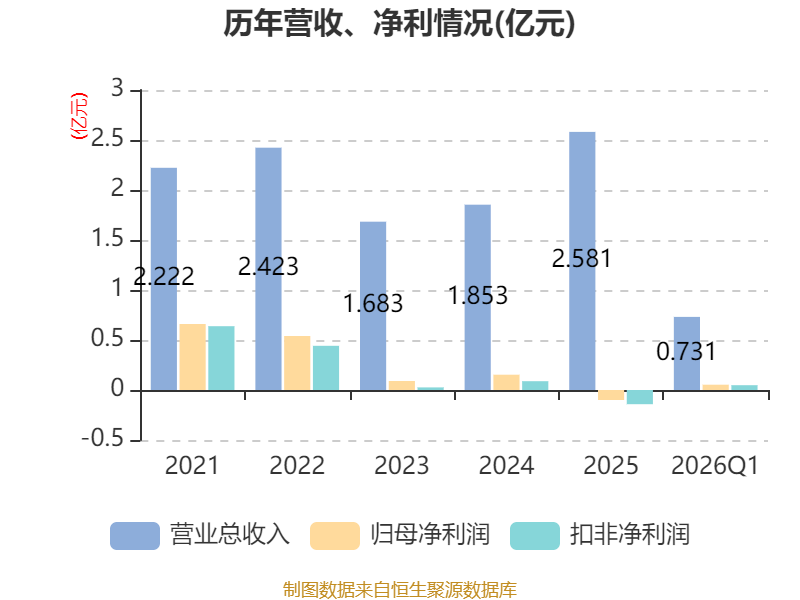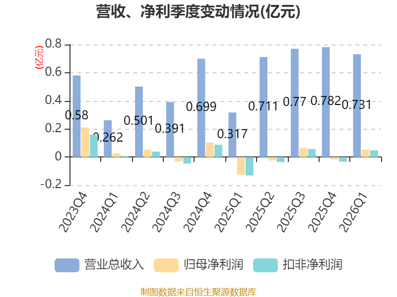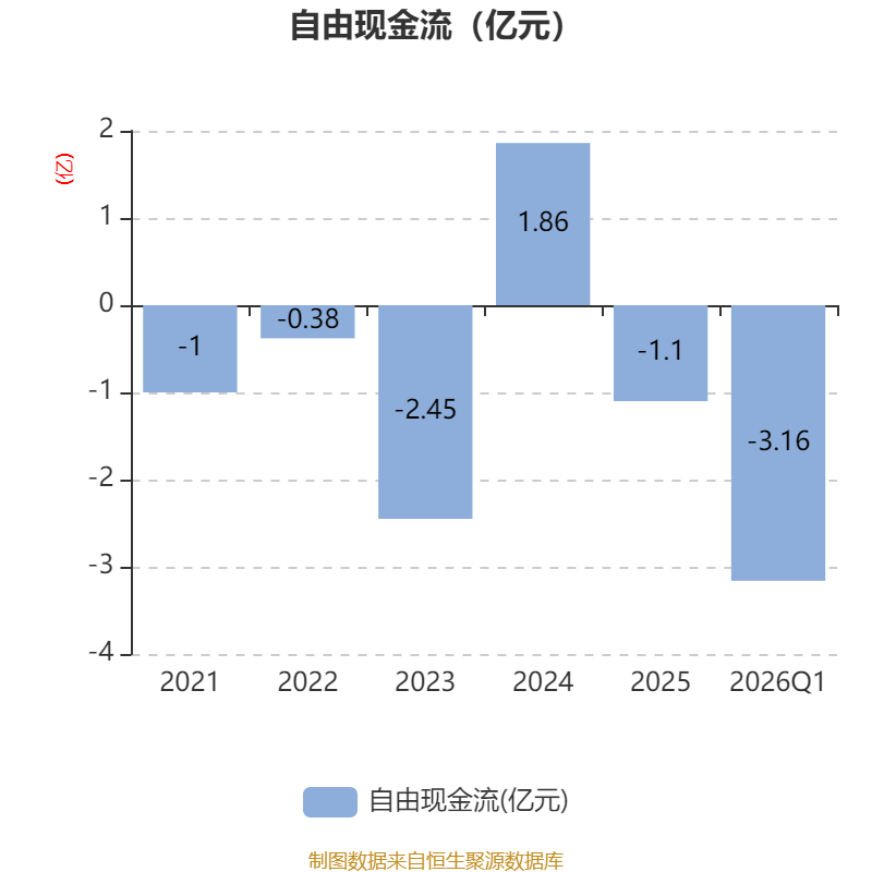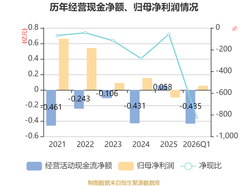 截至2026年一季度末,公司经营活动现金流净额为-4348.81万元,同比减少5087.38万元;筹资活动现金流净额2983.45万元,同比增加3143.62万元;投资活动现金流净额-2.08亿元,上年同期为-1.8亿元。