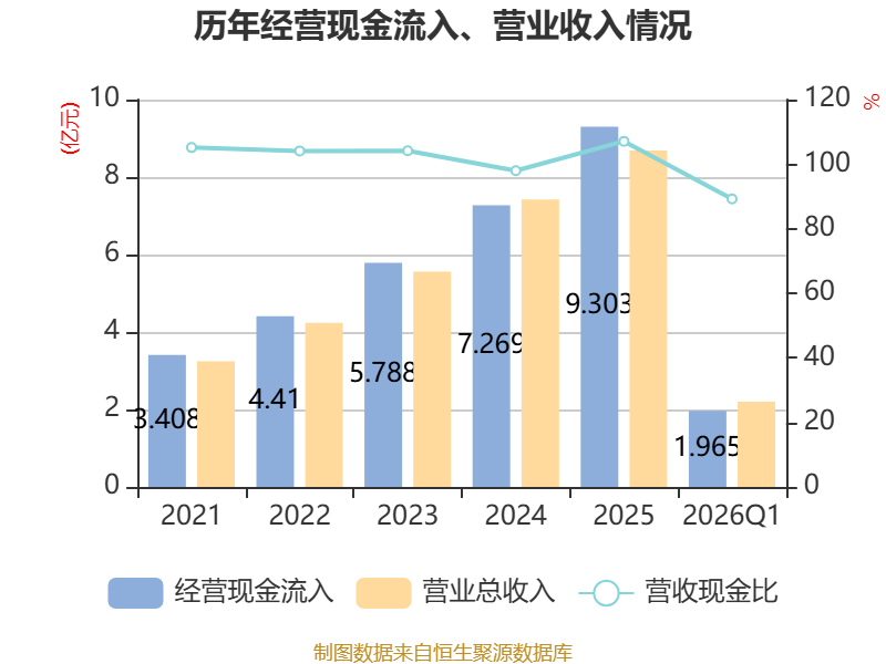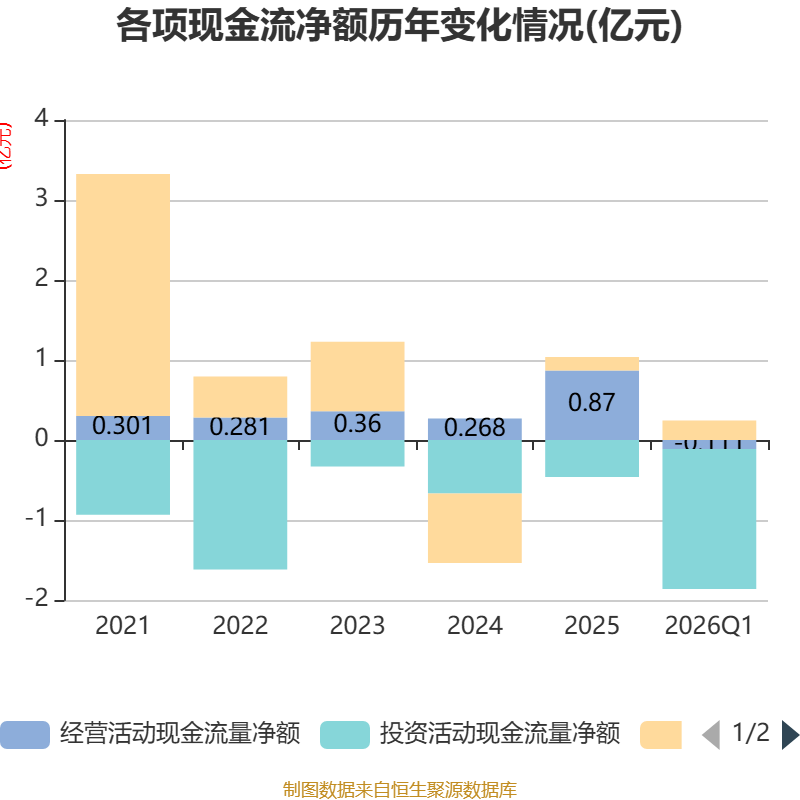 截至2026年一季度末,公司经营活动现金流净额为-1112.94万元,同比减少1995.81万元;筹资活动现金流净额2441.52万元,同比增加1989.69万元;投资活动现金流净额-1.75亿元,上年同期为-1.3亿元。