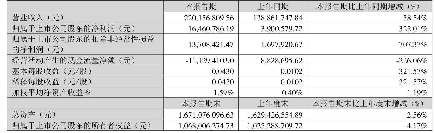 中证智能财讯博济医药(300404)4月25日披露2026年第一季度报告。公司实现营业总收入2.2亿元,同比增长58.54%;归母净利润1646.08万元,同比增长322.01%;扣非净利润1370.84万元,同比增长707.37%;经营活动产生的现金流量净额为-1112.94万元,上年同期为882.87万元;报告期内,博济医药基本每股收益为0.043元,加权平均净资产收益率为1.59%。