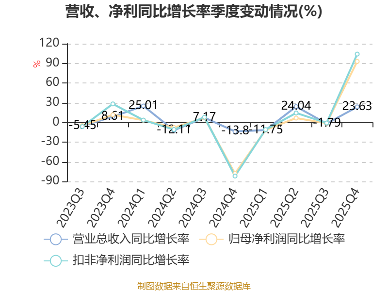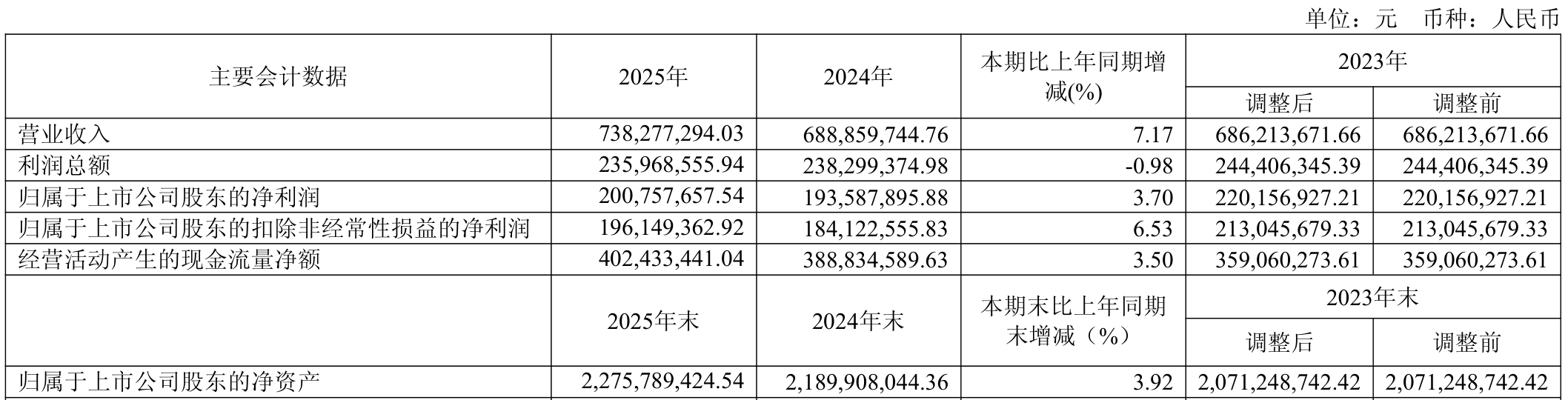 中证智能财讯芯能科技(603105)4月25日披露2025年年度报告。2025年,公司实现营业总收入7.38亿元,同比增长7.17%;归母净利润2.01亿元,同比增长3.70%;扣非净利润1.96亿元,同比增长6.53%;经营活动产生的现金流量净额为4.02亿元,同比增长3.50%;报告期内,芯能科技基本每股收益为0.4元,加权平均净资产收益率为9.06%。公司2025年度分配预案为:拟向全体股东每10股派现2元(含税)。
