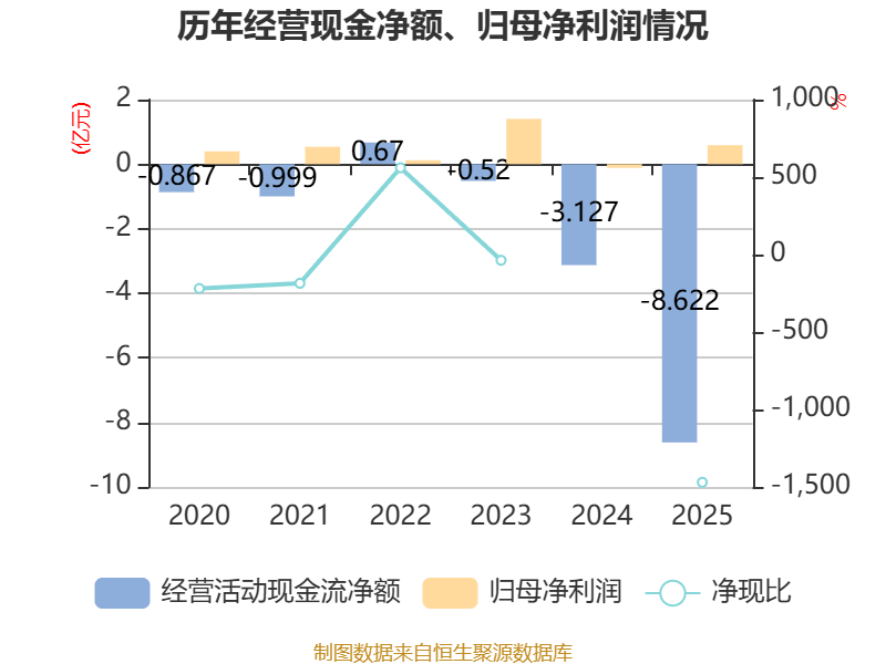 截至2025年,公司经营活动现金流净额为-8.62亿元,同比减少5.49亿元;筹资活动现金流净额31.61亿元,同比增加31.85亿元;投资活动现金流净额-11.42亿元,上年同期为5.52亿元。