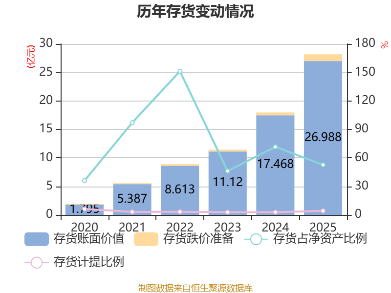 从存货变动来看,截至2025年末,公司存货账面价值为26.99亿元,占净资产的52.71%,较上年末增加9.52亿元。其中,存货跌价准备为1.19亿元,计提比例为4.24%。