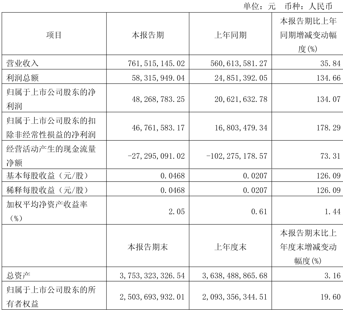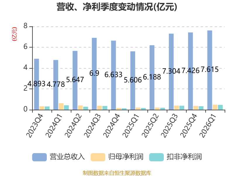 中证智能财讯福蓉科技(603327)4月25日披露2026年第一季度报告。公司实现营业总收入7.62亿元,同比增长35.84%;归母净利润4826.88万元,同比增长134.07%;扣非净利润4676.16万元,同比增长178.29%;经营活动产生的现金流量净额为-2729.51万元,上年同期为-1.02亿元;报告期内,福蓉科技基本每股收益为0.0468元,加权平均净资产收益率为2.05%。