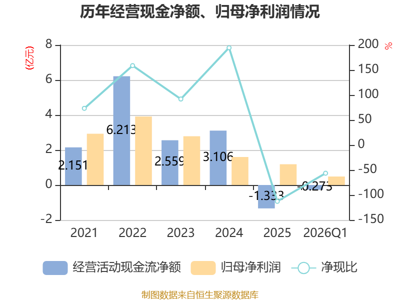 截至2026年一季度末,公司经营活动现金流净额为-2729.51万元,同比增加7498.01万元;筹资活动现金流净额1.42亿元,同比增加3261.37万元;投资活动现金流净额-6199.81万元,上年同期为-3.86亿元。