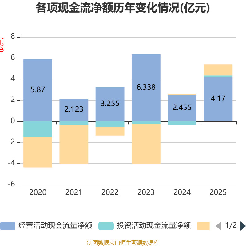 截至2025年,公司经营活动现金流净额为4.17亿元,同比增长69.9%;筹资活动现金流净额1.05亿元,同比增加9355.45万元;投资活动现金流净额1784.61万元,上年同期为-3870.46万元。