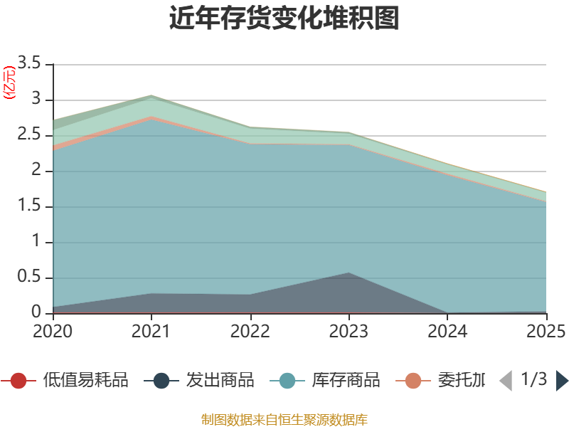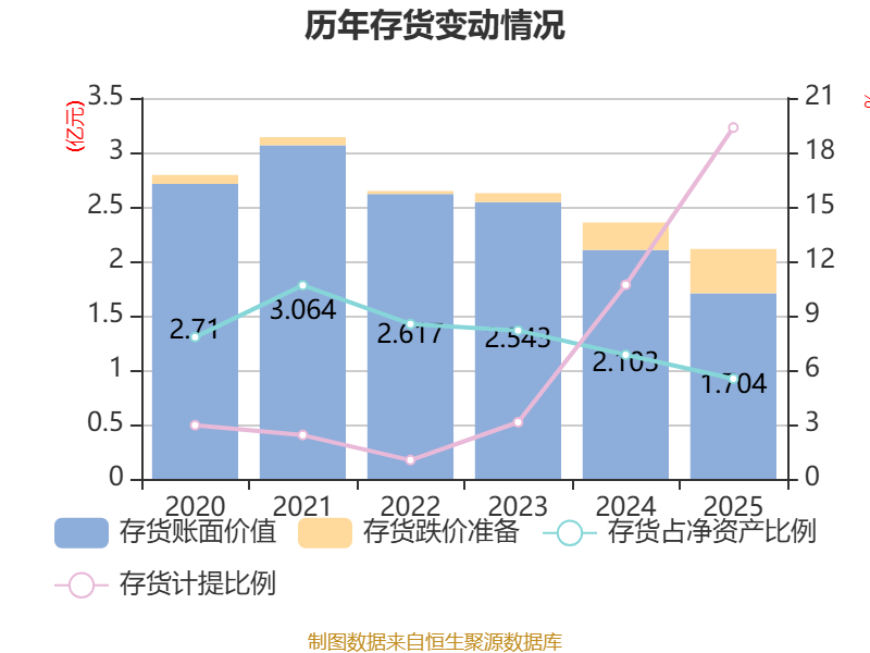 从存货变动来看,截至2025年末,公司存货账面价值为1.7亿元,占净资产的5.52%,较上年末减少3992.64万元。其中,存货跌价准备为4091.99万元,计提比例为19.37%。