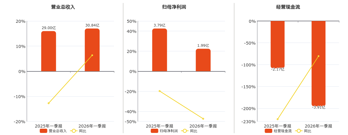 公司营业总收入为30.84亿元,在已披露的同业公司中排名第1,较去年同报告期营业总收入增加1.84亿元,同比较去年同期上涨6.35%。归母净利润为1.99亿元,在已披露的同业公司中排名第1,较去年同报告期归母净利润减少1.79亿元,同比较去年同期下降47.37%。经营活动现金净流入为-3.91亿元,在已披露的同业公司中排名第8,较去年同报告期经营活动现金净流入减少1.74亿元。