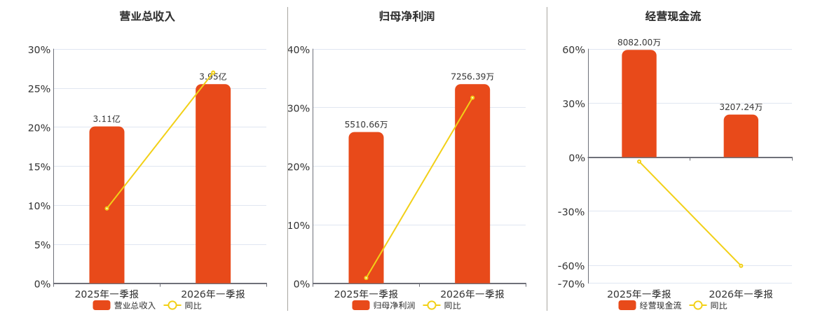 公司营业总收入为3.95亿元。归母净利润为7256.39万元。经营活动现金净流入为3207.24万元,较去年同报告期经营活动现金净流入减少4874.76万元,同比较去年同期下降60.32%。