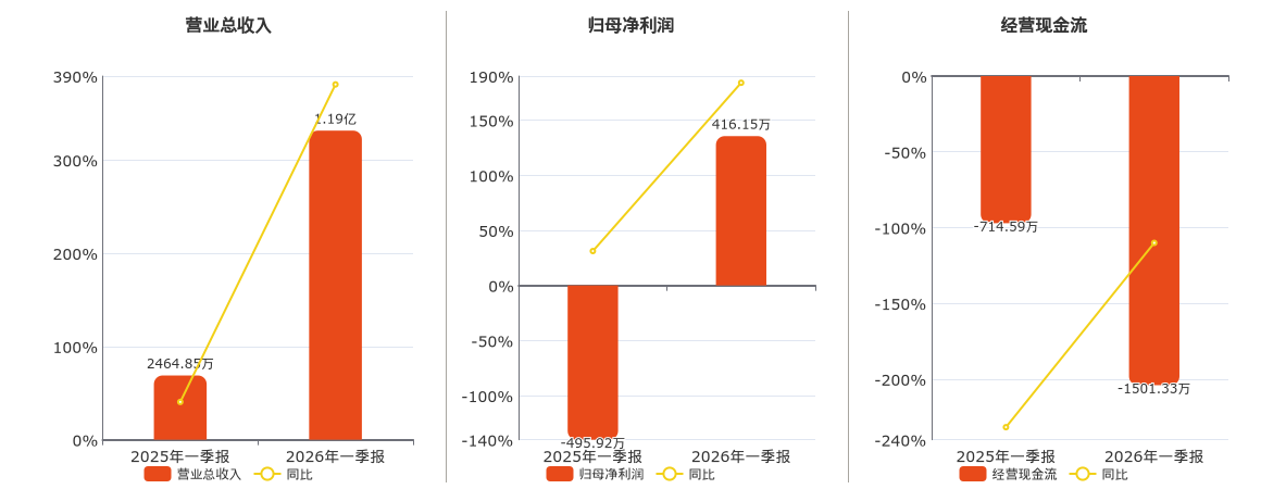 公司截至2026年3月31日,*ST天山营业总收入为1.19亿元,在已披露的同业公司中排名第12。截至2026年3月31日,*ST天山归母净利润为416.15万元。截至2026年3月31日,*ST天山经营活动现金净流入为-1501.33万元,在已披露的同业公司中排名第7,较去年同报告期经营活动现金净流入减少786.74万元。