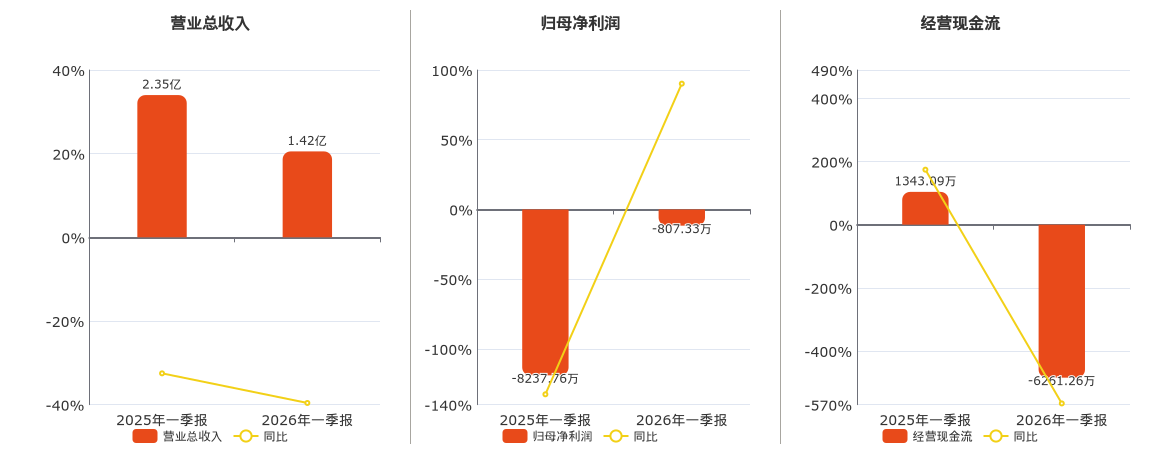公司截至2026年3月31日,*ST三圣营业总收入为1.42亿元,较去年同报告期营业总收入减少9303.54万元,同比较去年同期下降39.60%。截至2026年3月31日,*ST三圣归母净利润为-807.33万元。截至2026年3月31日,*ST三圣经营活动现金净流入为-6261.26万元,较去年同报告期经营活动现金净流入减少7604.35万元,同比较去年同期下降566.18%。