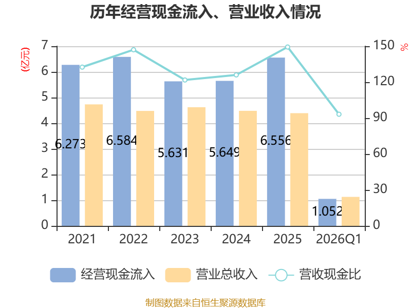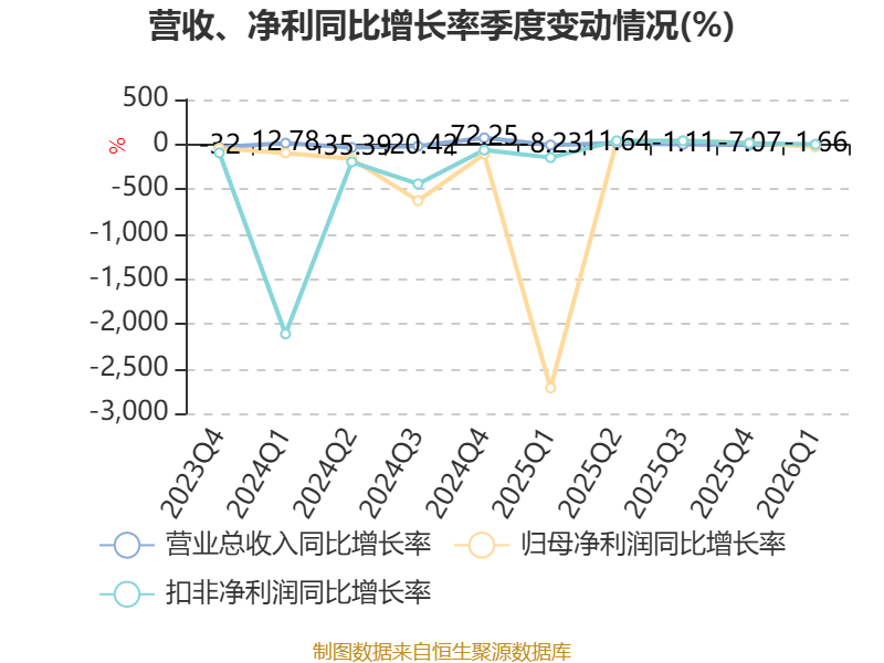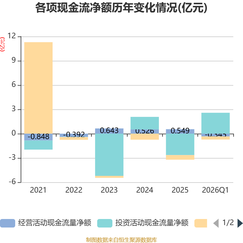 截至2026年一季度末,公司经营活动现金流净额为-3448.6万元,同比减少2251.92万元;筹资活动现金流净额-3841.98万元,同比减少2692.84万元;投资活动现金流净额2.58亿元,上年同期为-1.69亿元。