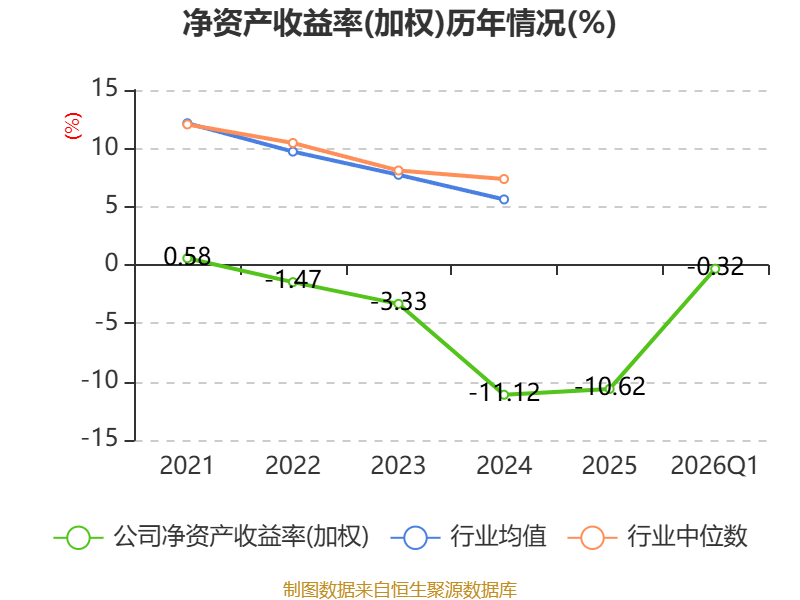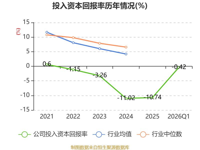 盈利能力方面, 2026年一季度公司加权平均净资产收益率为-0.32%,同比下降0.09个百分点。公司2026年第一季度投入资本回报率为-0.42%,较上年同期上升0.06个百分点。